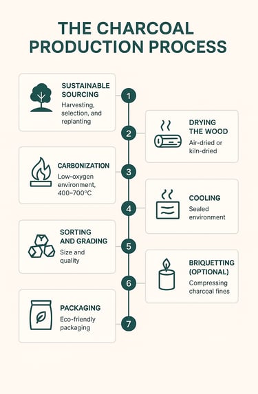 At Royal Charcoal, We take pride in transforming nature’s resources into Premium-Quality Charcoal through a process that is both Efficient and Environmentally Responsible. Our Charcoal begins its journey with Sustainably Sourced Hardwood, carefully harvested to Protect Ecosystems. Through Controlled Carbonization, the wood is slowly heated in Low-Oxygen Environments, converting it into High-Density Charcoal with exceptional Burning Qualities. Finally, our Advanced Processing and Grading Systems ensure that every piece meets International Standards for Consistency, Cleanliness, and Performance — ready to deliver the best Cooking and Heating experience for our customers.
